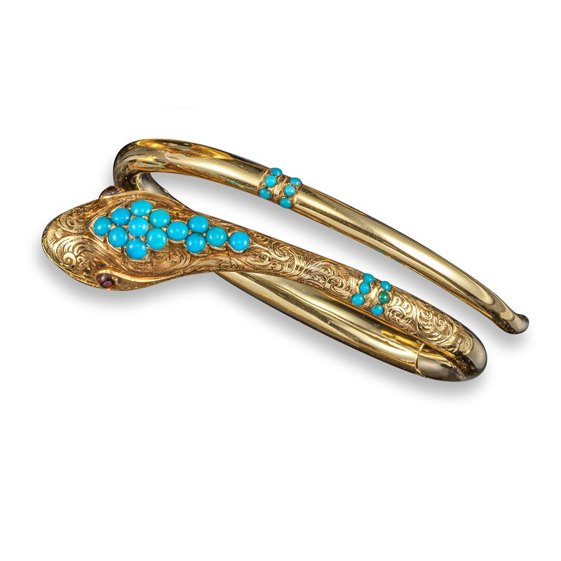 A Victorian gold and turquoise snake bangle, with engraved decoration, turquoise cabochons and garnet eyes, 5.2cm inner diameter
