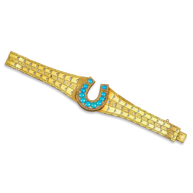 A 19th century turquoise and diamond bracelet, the central horseshoe set with cabochon turquoise within borders of rose-cut diamonds, on articulated textured and smooth yellow gold bracelet, the tongue with rubbed marks including maker S.A 72 and rubbed kokoschnik, 19cm long