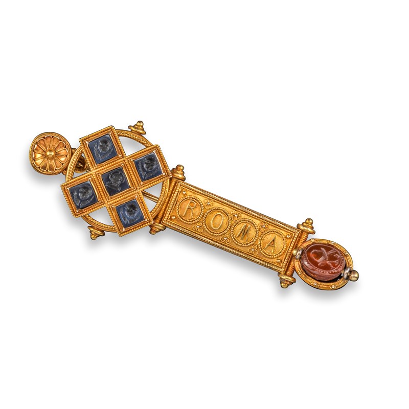 An Etruscan-Revival 19th century gold brooch, the terminals formed with a rotating small Etruscan carnelian scarab, (c. 3rd century BC), and carved with a bird, with a circular filigree rosette to the other, the cross design mounted with five lozenge-shaped hardstones centred with Christ and four winged faces probably depicting the disciples, the body applied with four fine wirework circles spelling ROMA, 7cm wide
