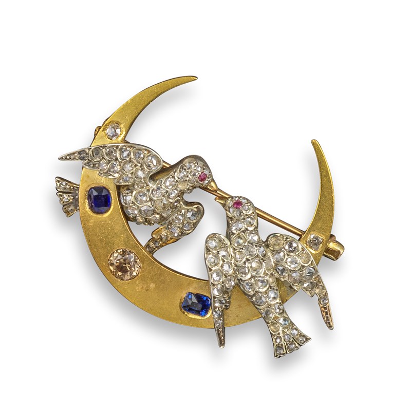 A Victorian gem-set brooch, depicting two diamond-set doves within a crescent moon set with sapphires and a fancy-coloured diamond in silver and gold, 4cm wide