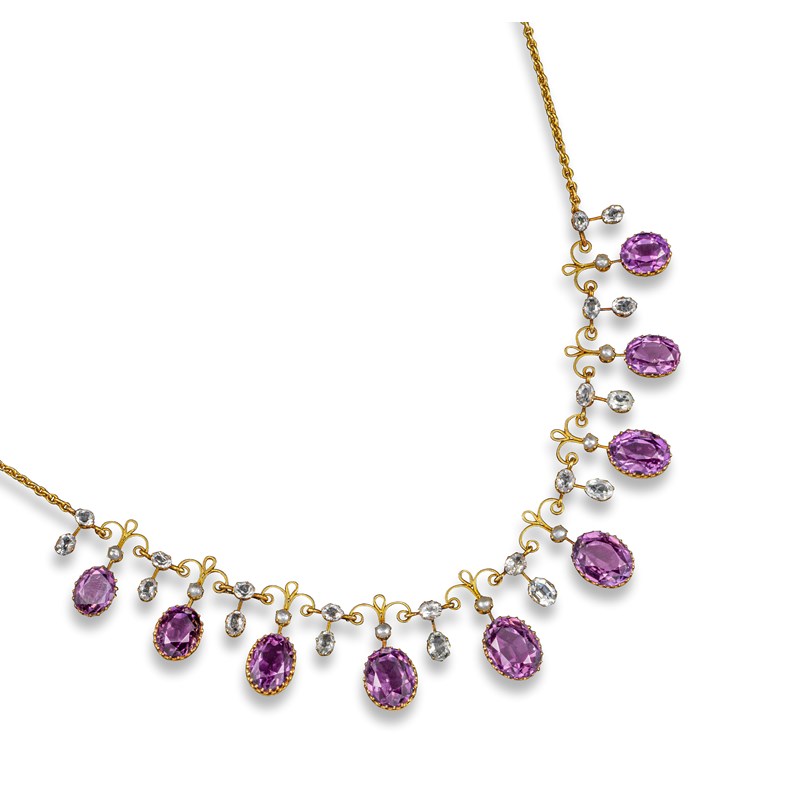 An Edwardian amethyst and goshenite necklace, the graduated oval-shaped amethysts suspend from seed pearls and are alternately-set with pairs of oval-shaped goshenites, set in gold and on a fine-link gold neck chain, 43cm long