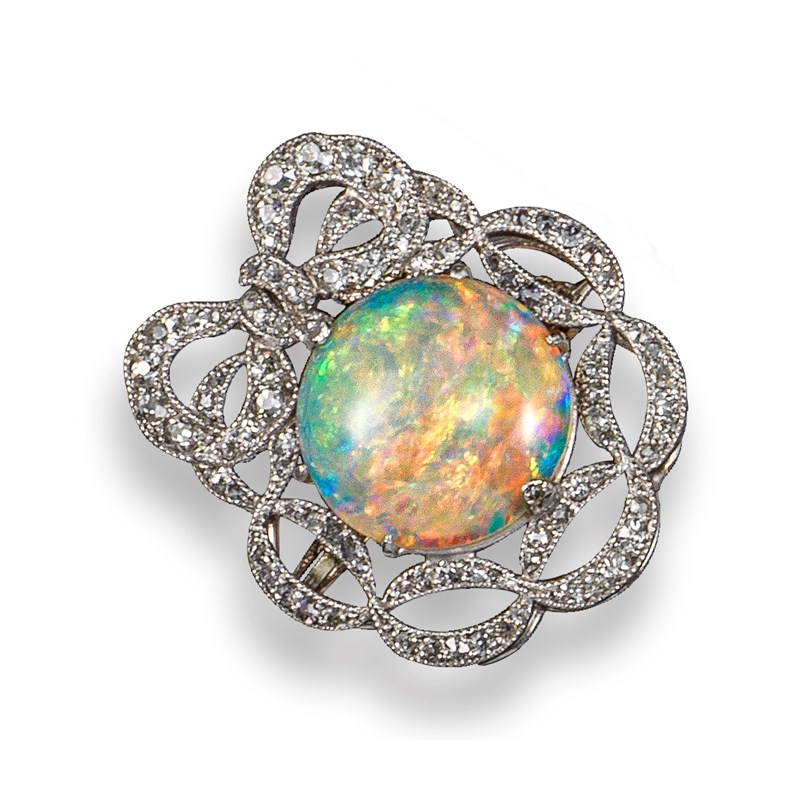 An Edwardian opal and diamond brooch, centred with a circular-shaped opal in an openwork surround of single-cut diamonds and suspending a diamond-set bow, 2.7cm high