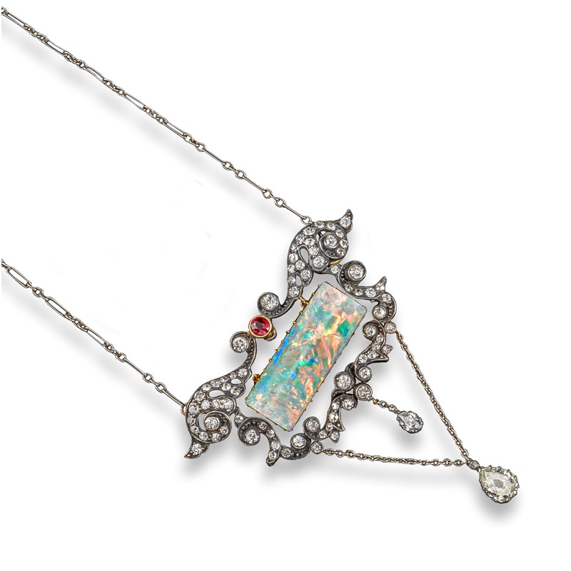 A opal, diamond and ruby pendant, centred with a rectangular opal plaque, the scrolling mount set with old circular-cut diamonds, surmounted with a circular-cut ruby and suspending pear-shaped diamond drops in silver on gold, on an oval-link neck chain, pendant 5cm high, chain 38cm long