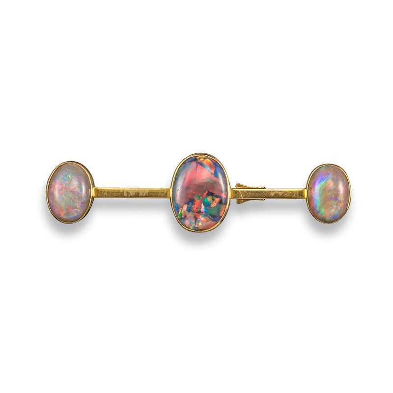 A gold brooch set with three oval-shaped opals, the centre oval-shaped solid black opal displays a selection of colours and is set with a white opal to each shoulder in yellow gold, 6.2cm wide, case