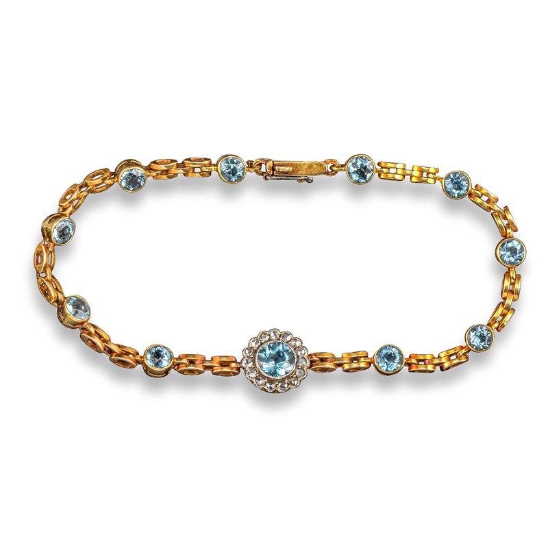 An Edwardian aquamarine and diamond bracelet, set with a central aquamarine and diamond cluster on yellow gold bracelet set with smaller aquamarines, 17.5cm long