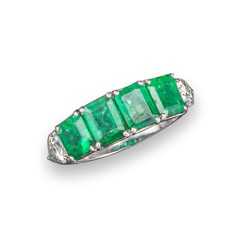 An emerald and diamond half-hoop ring, set with graduated emerald-cut emeralds with a pear-shaped diamond to each shoulder in platinum, with scratched inventory number and signed CAPRI, size K