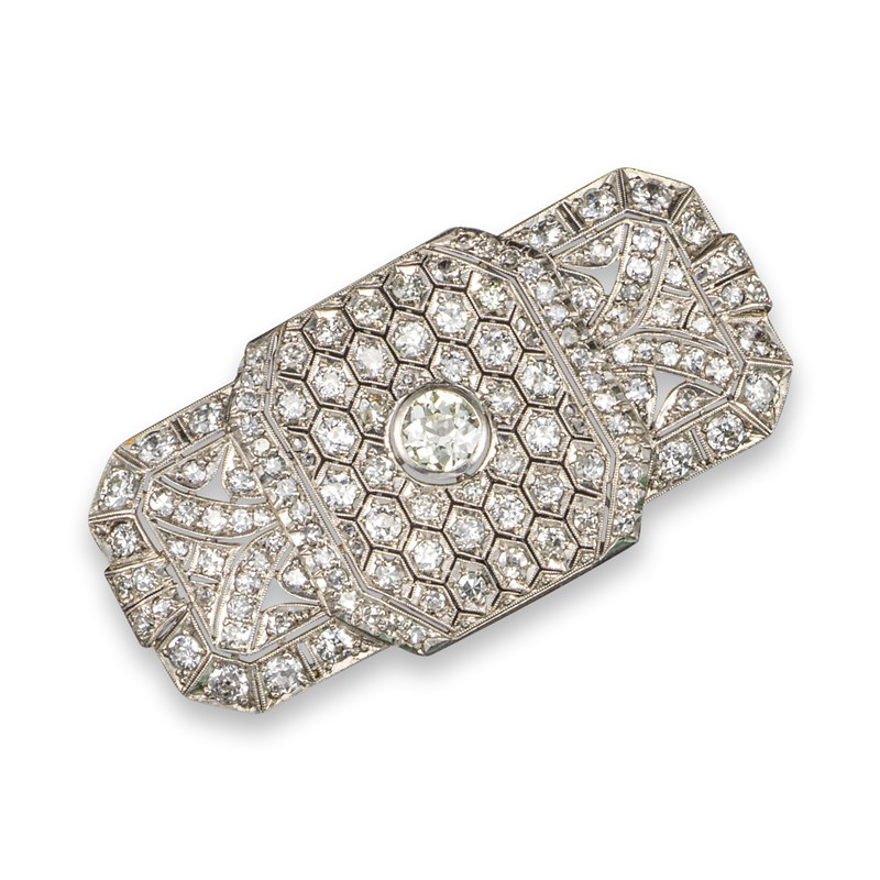 An Art Deco diamond brooch, of rectangular form, centred with an old circular-cut diamond, pierced with geometric design and millegrain-set overall with old circular-cut diamonds in platinum, 5.5cm wide