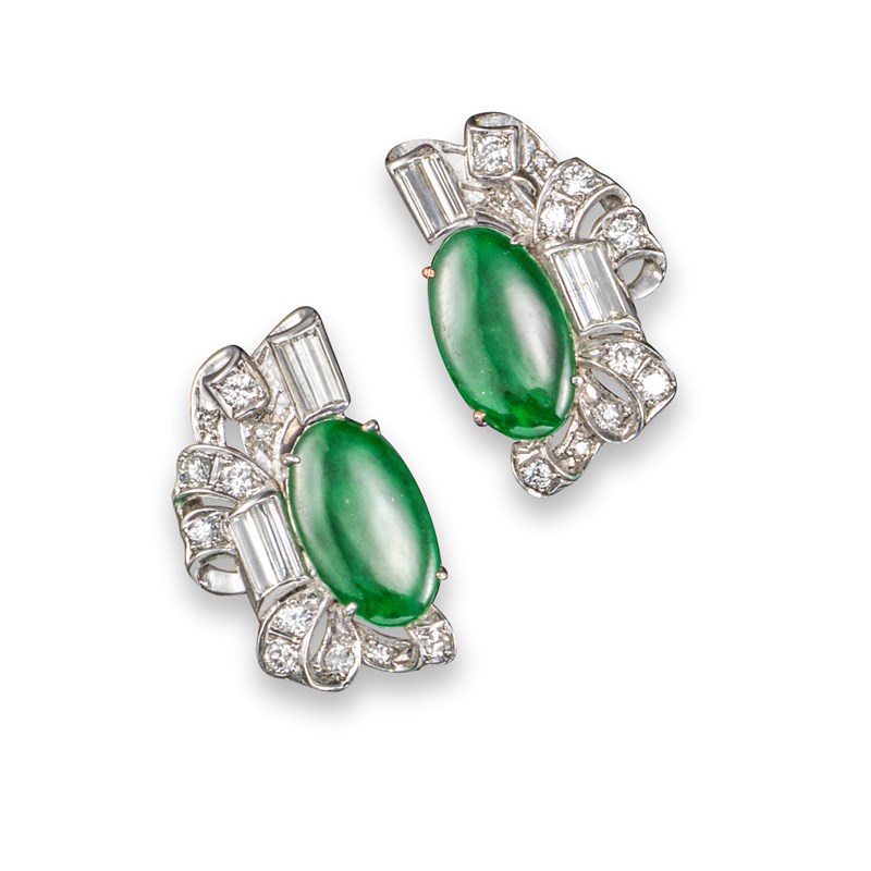 A pair of jadeite and diamond scroll earrings, the oval jade cabochons set within scrolling surround of baguette-shaped and circular-cut diamonds in white gold, 2.8cm wide