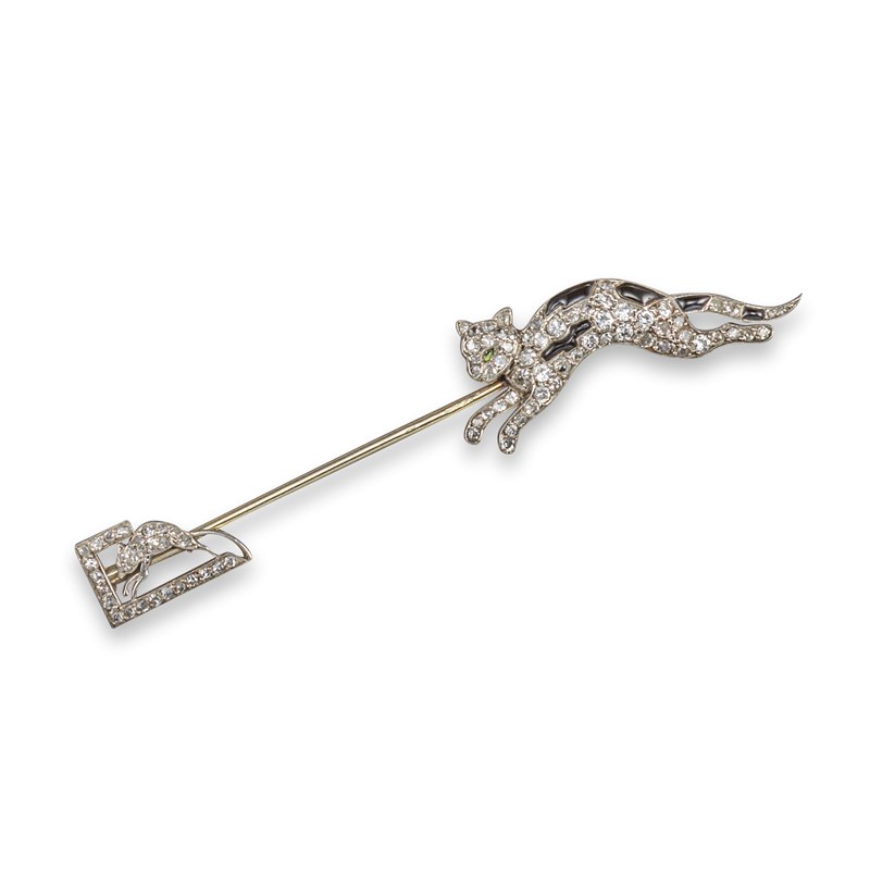 An Art Deco French onyx and diamond jabot pin, depicting a black and white cat pave-set with graduated diamonds and onyx, chasing a diamond-set mouse, in platinum and gold, French control marks, 7.8cm long