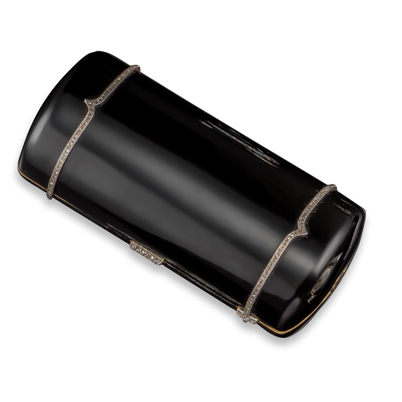 An Art Deco black enamel minaudière, with tapered linear diamond decoration and a diamond thumbpiece, with detachable gold pencil, hinged opening and a mirror to interior, 8.5cm long, 142g