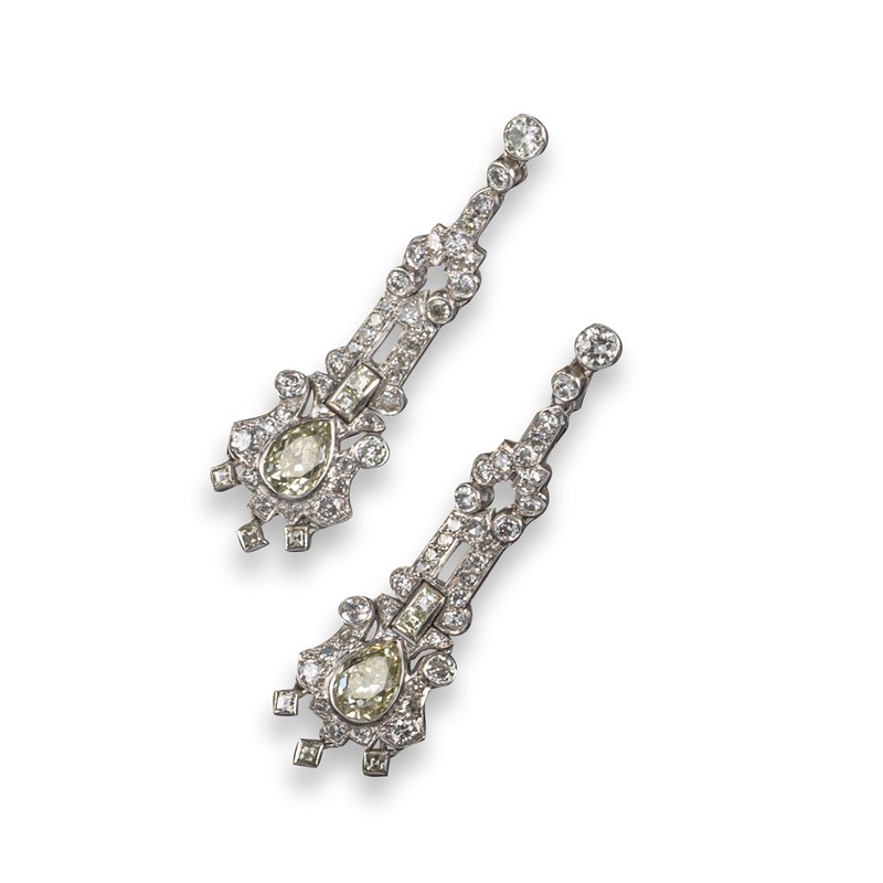A pair of diamond drop earrings, of geometric design, each articulated earring set with a principal pear-shaped diamond within further circular-cut diamonds, each suspending three square-shaped diamonds in white gold, post fittings, 4.5cm high