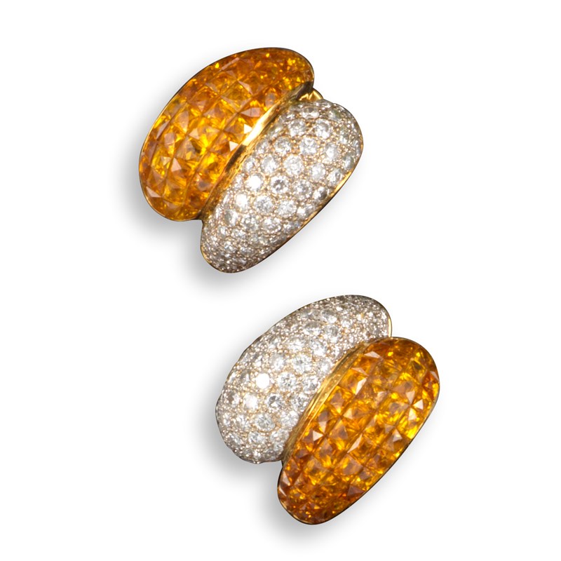 A pair of sapphire and diamond gold earrings, the crossover bombé sections pavé-set with round brilliant-cut diamonds and invisibly-set with French-cut orange sapphires in yellow gold, retractable posts and with clip fittings, 2cm high