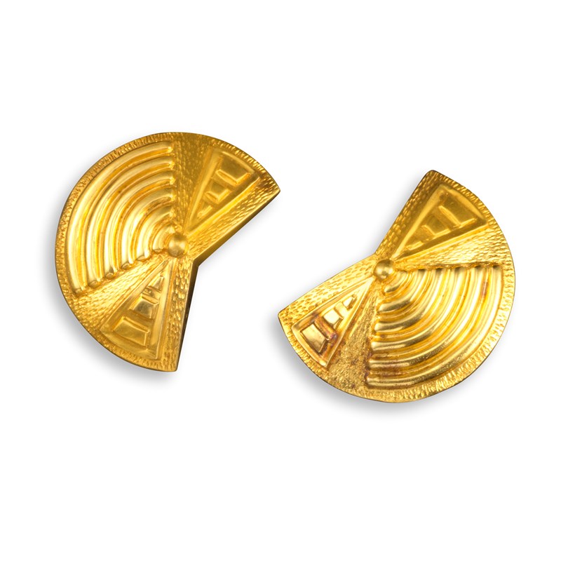 A pair of gold earrings by Lalaounis, the crescent-shaped earrings with geometric and fluted decoration in yellow gold, signed Lld and with maker's mark, London import marks for 1990, clip fittings, 3.7cm high, case by Lalaounis
