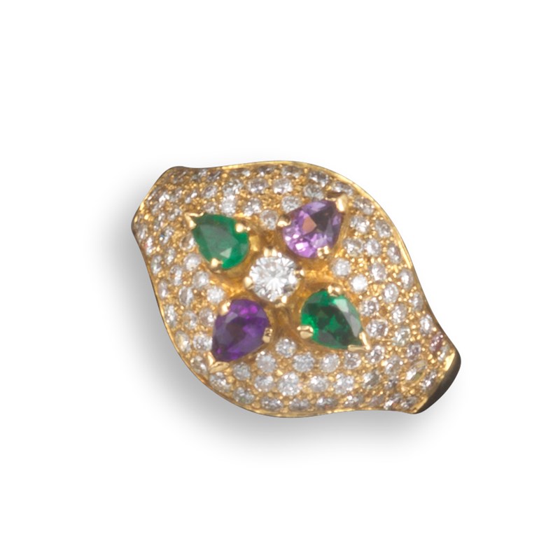 A diamond and gem-set gold bombé ring, pavé-set with round brilliant-cut diamonds and pear-shaped emeralds and amethysts in yellow gold, size M