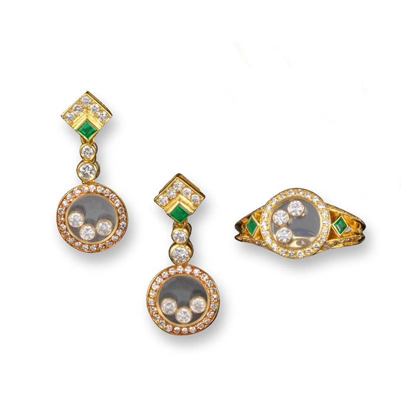 A pair of 'Happy Diamonds' earrings and by Chopard, the earrings set with round brilliant-cut diamonds and square-shaped emeralds in yellow gold, the diamond-set glazed centre sections suspend lose diamonds within, signed Chopard, each 2.7cm high, together with a ring with bifurcated shoulders and set with further circular-cut diamonds to the gallery, ring size O 1/2 (ring not signed)