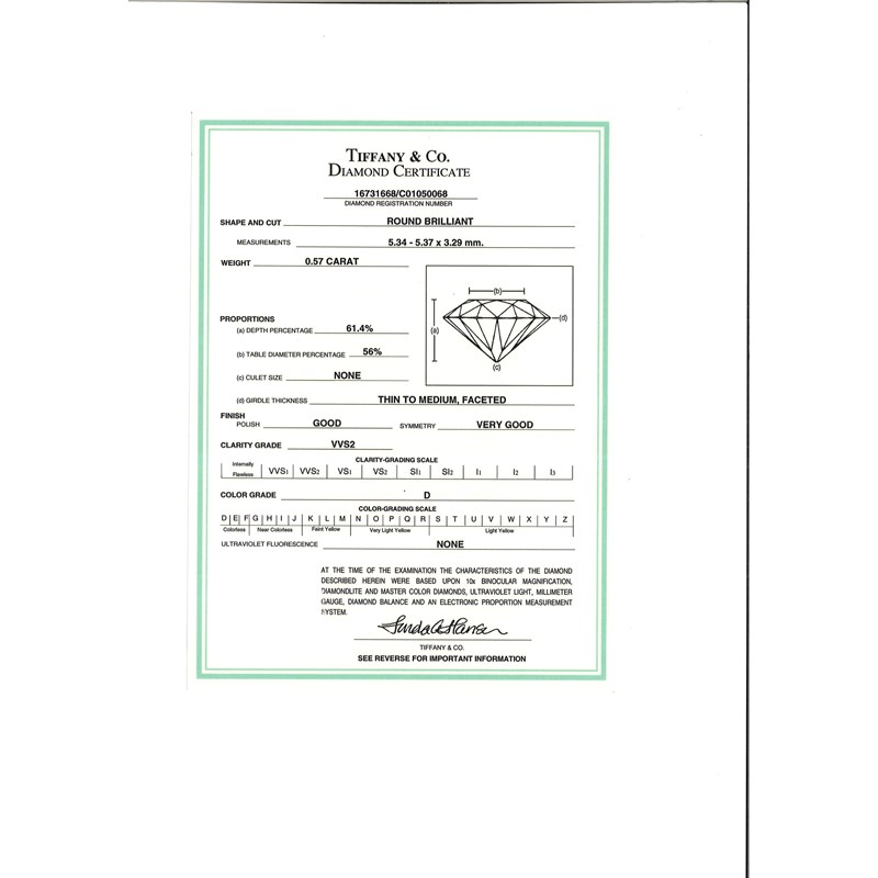Accompanied by Tiffany&Co diamond certificate number 16731668/C01050068 stating that the round brilliant-cut diamond weighs 0.57cts and has D colour, VVS2 clarity and no fluorescence.