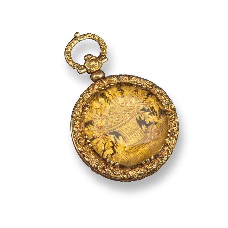 A Regency citrine-set gold viniagrette, set with a circular-cut citrine above a grille of giardinetto design, the mount with foliate engraved decoration and with engine-turned decoration to the reverse, 3.8cm high
