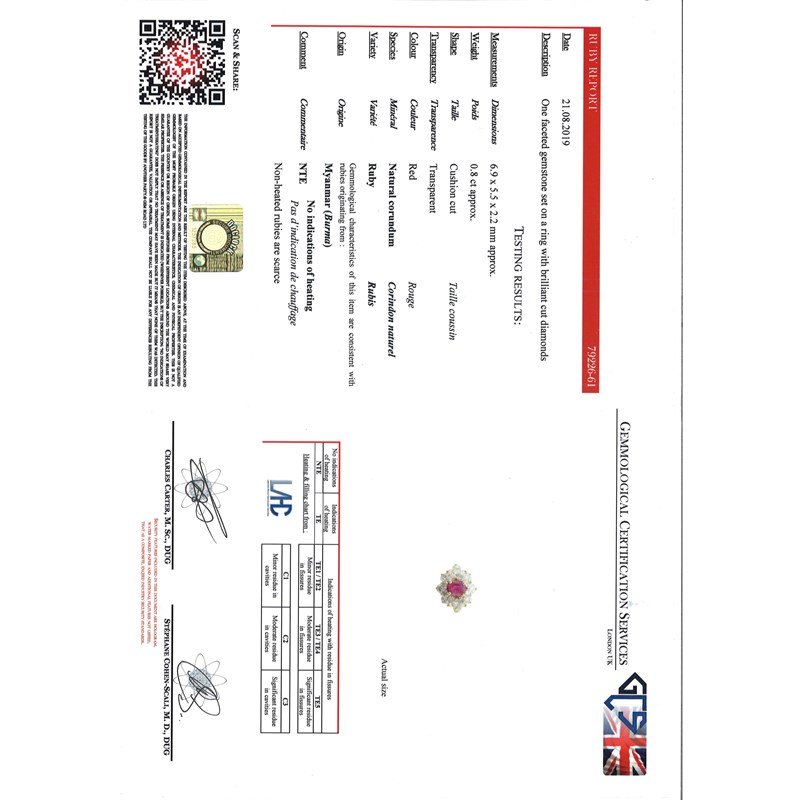 Accompanied by report number 79226-61 dated 21 August 2019 from GCS, London stating that the cushion-shaped ruby weighs 0.80cts approximately and is a natural ruby with no indications of heat treatment. Origin: Burma (Myanmar)