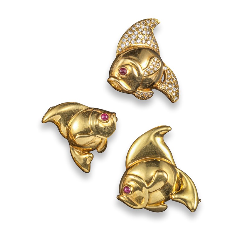 A set of three graduated gold fish brooches, with ruby cabochon eyes, one pave-set with diamond fins in yellow gold, largest 3cm high