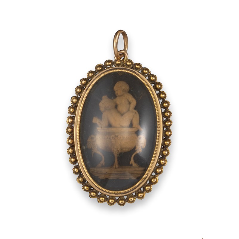 An early 19th century boxwood pendant attributed to Giuseppe Bonzanigo (1745 - 1820), depicting two putti in boxwood on ebonised wood ground, glazed and in gold surround, 4.2cm high