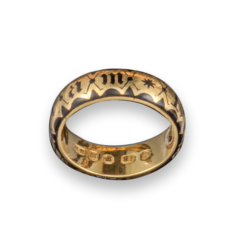 A late Victorian gold mourning ring, with black enamel decoration reading 'In memoriam', engraved with initials E.M. to the interior and with internal glazed locket compartment, with maker's mark GM and 18ct London hallmarks for 1880, size I 1/2
