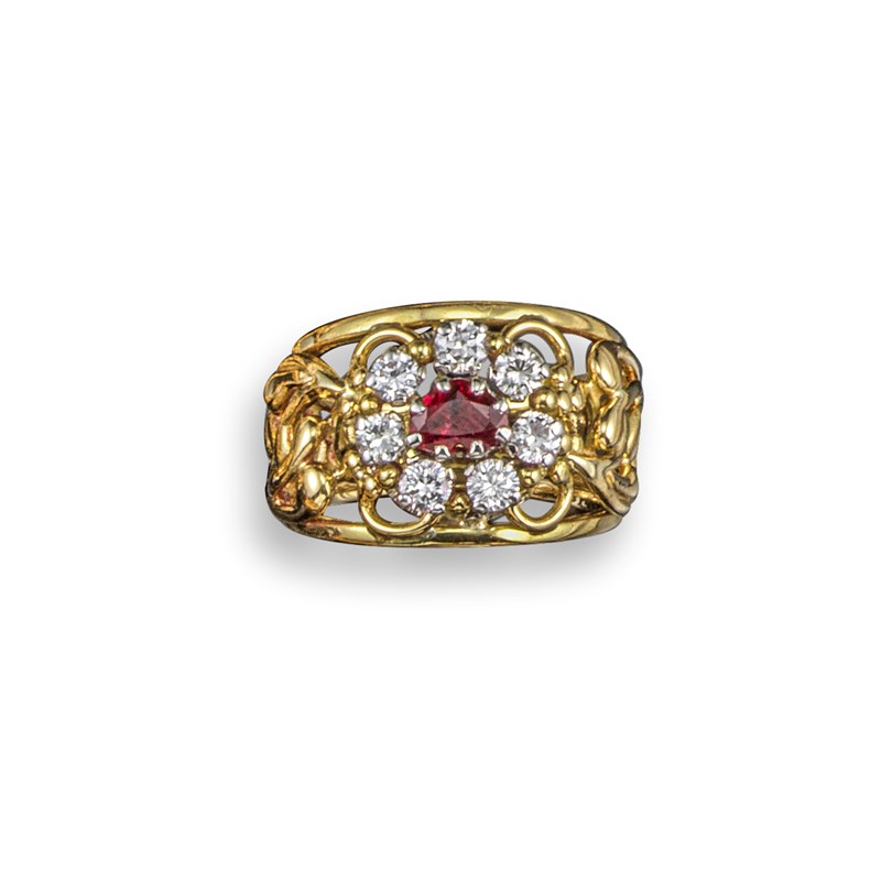 A ruby and diamond cluster ring by Valerie Pickford, the openwork gold ring with foliate scroll decoration and centred with a heart-shaped ruby within a surround of circular-cut diamonds, with maker's mark V.E.P and with 18ct hallmarks for London 1987, size K 1/2