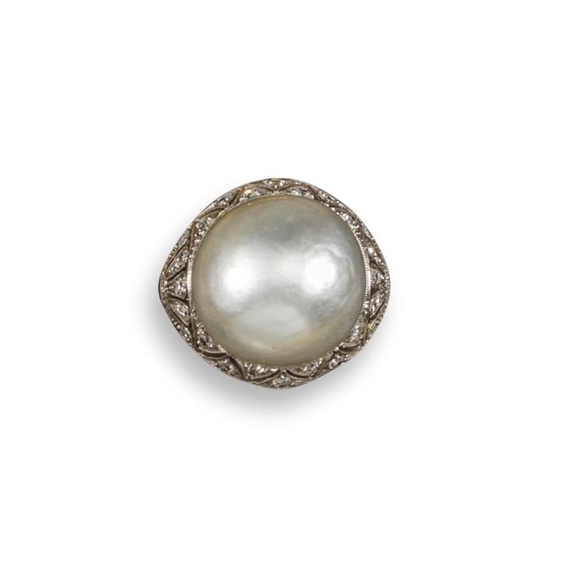 A cultured pearl and diamond ring, the cultured pearl is set in a diamond-set platinum mount with openwork geometric design and with scallop motif to the shoulders, size K 1/2