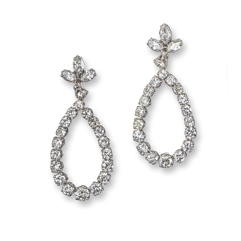 A pair of diamond drop earrings, the marquise-shaped trefoils suspend diamond drops in white gold, 4.8cm high