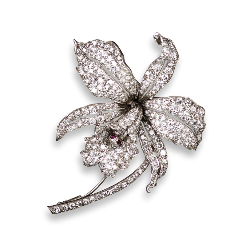 A diamond-set orchid brooch, realistically designed and pavé-set with graduated circular-cut diamonds and two ruby cabochons in white gold, 6cm high