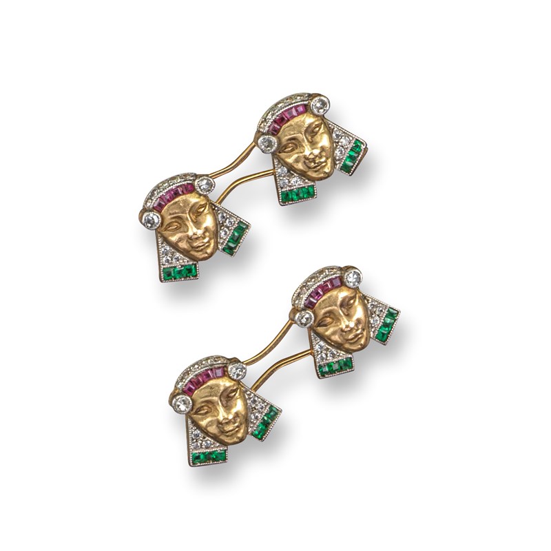 A pair of Art Deco gem-set cufflinks, designed as stylised pharaoh heads, their headdresses set with old circular and single-cut diamonds, square-shaped emeralds and rubies in platinum and gold, each link 1.1cm high, case