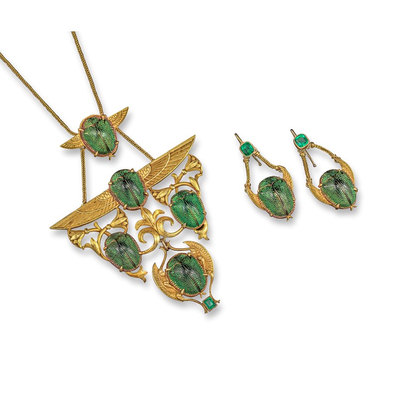 An Art Nouveau Egyptian Revival gold pendant, decorated with stylised lotus flowers, wings set with green scarab beetles and terminated with an emerald-cut emerald, the lower section detaches to be worn as a brooch with a detachable brooch pin, on ropetwist gold neck chain, pendant 8cm high, chain 40.5cm long and with additional extension chain, with matching earrings set with scarabs within stylised gold wings and suspending from emeralds in yellow gold, 3.5cm high, shepherd's hook fittings, fitted case