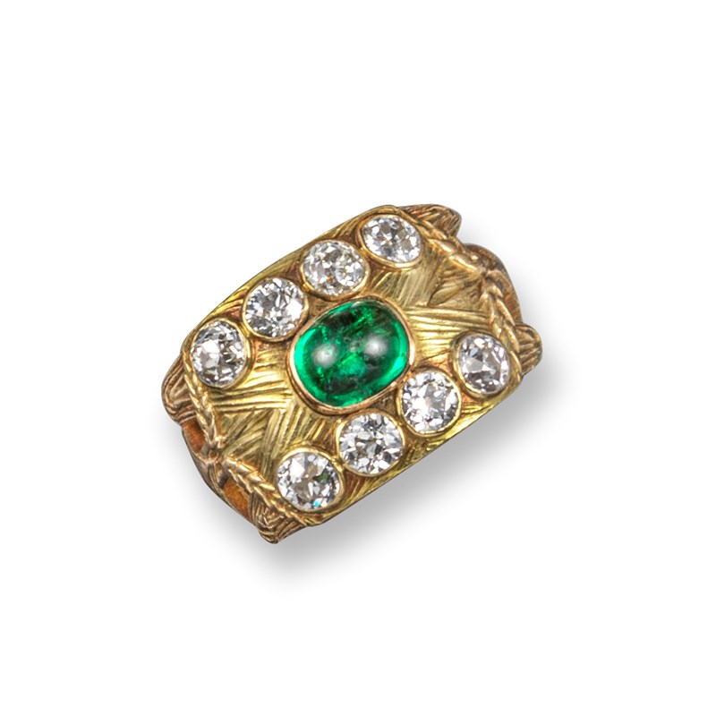 An Art Nouveau emerald and diamond ring by René Lalique, set with a sugarloaf emerald within borders of eight old cushion-shaped diamonds, within carved and pierced wheatsheaf-designed yellow gold shank, signed and with Polish marks for Warsaw, size P