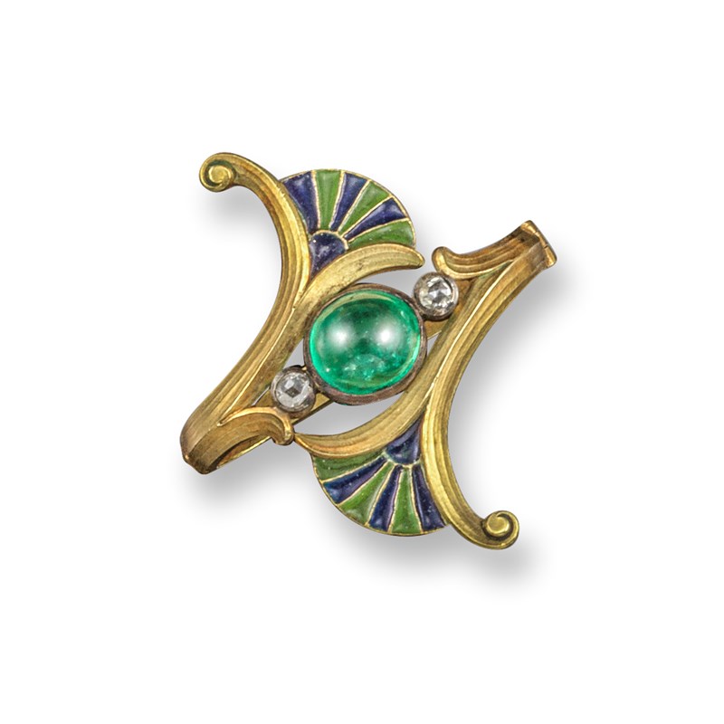 An Art Nouveau Egyptian Revival gold scarf ring, set with a cabochon emerald flanked with diamonds within plique-a-jour enamel stylised lotus flowers, set in textured yellow gold, 2.7cm wide