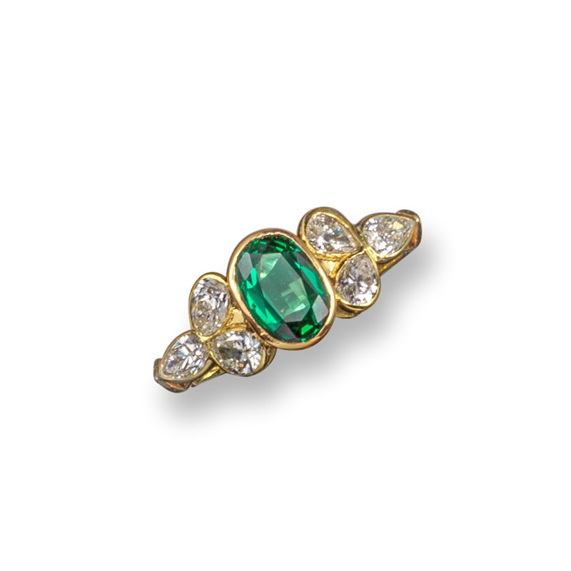 An emerald and diamond cluster ring, the oval-shaped emerald is rubover-set in yellow gold with a trefoil of pear-shaped diamonds to each shoulder, obscured maker's mark and 18ct London hallmarks for 1986, size M (approx. with inner resizing balls)