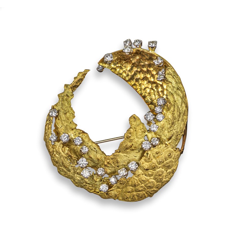 An abstract diamond brooch attributed to Andrew Grima, the textured 18ct yellow gold brooch decorated with graduated circular-cut diamonds in yellow gold, with London hallmarks for 1965 and maker's mark HJCo for Haller Jewellery Company Limited, 4.7cm wide