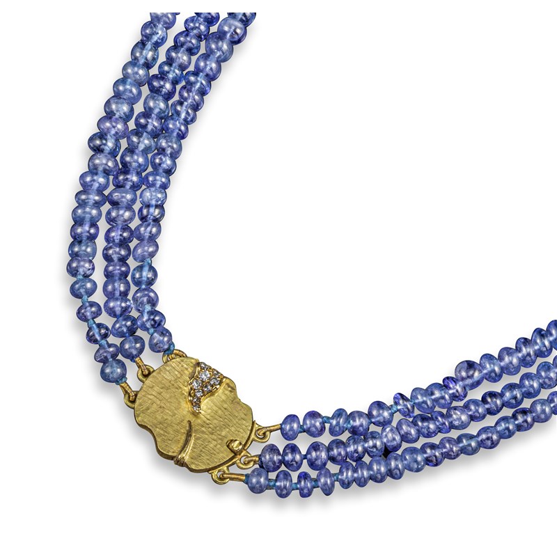 A tanzanite necklace with a gold clasp by Andrew Grima, of abstract design, set with a cluster of round brilliant-cut diamonds, on a three-row graduated tanzanite bead necklace, clasp 1.8cm wide, necklace 45cm shortest