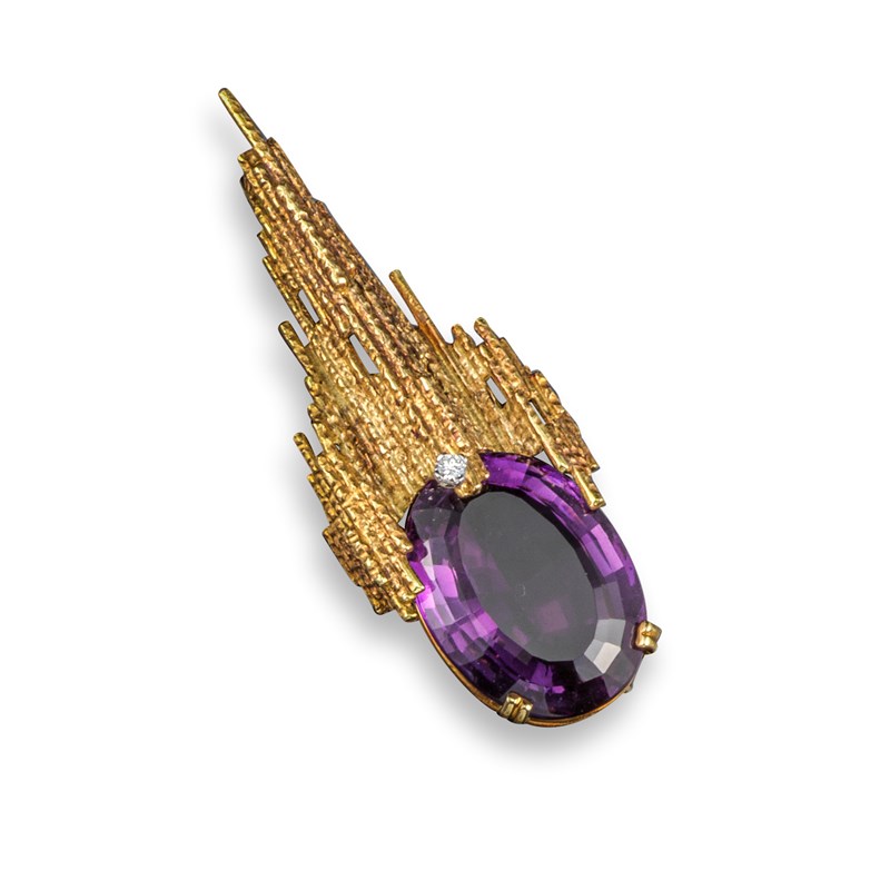 An amethyst and diamond-set pendant by Andrew Grima, the oval-shaped amethyst surmounted by an openwork textured yellow gold chevron, set with a single round brilliant-cut diamond, signed AG Ltd and with 18ct London hallmarks for 1984, 5.5cm high