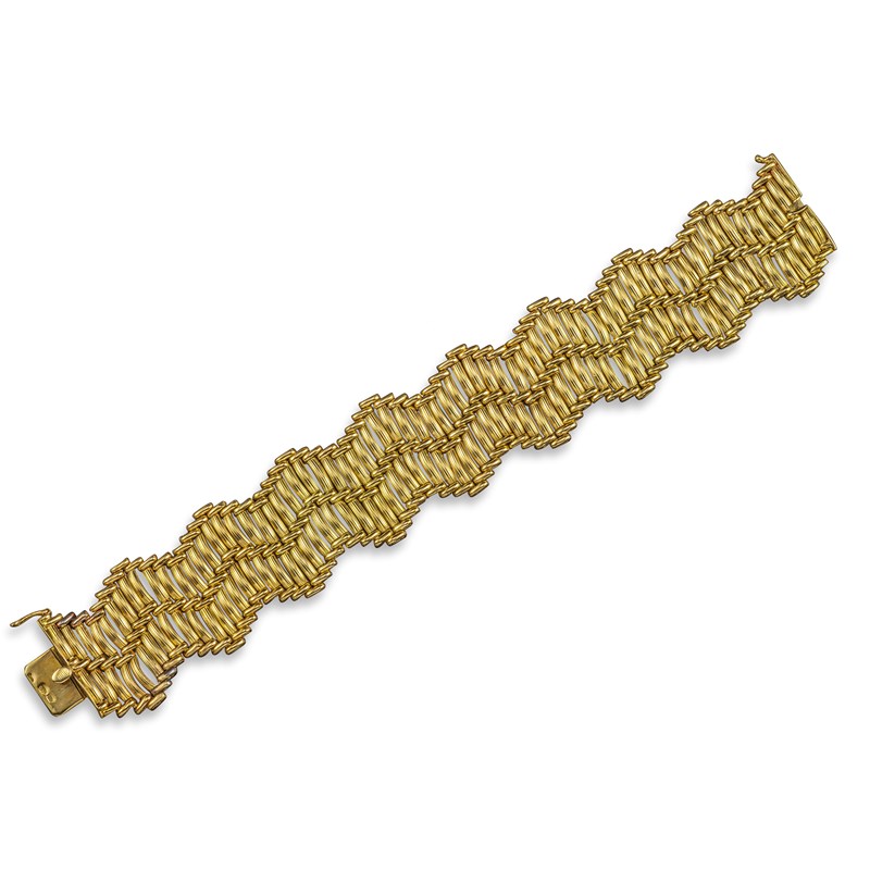 A gold fancy-link bracelet by Garrard & Co, 1960s, the textured fancy links in a zig zag design, with London import marks for 18ct 1960 and maker's mark G E Co, 19.5cm long, 83.8g