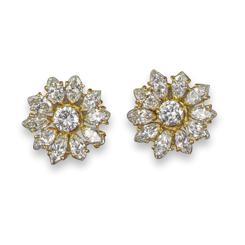 A pair of diamond cluster earrings, of flowerhead design, each centred with a round brilliant-cut diamond within a surround of marquise-shaped diamonds in yellow gold, centre diamonds approx. 1.30cts total, post and clip fittings, 2.2cm high