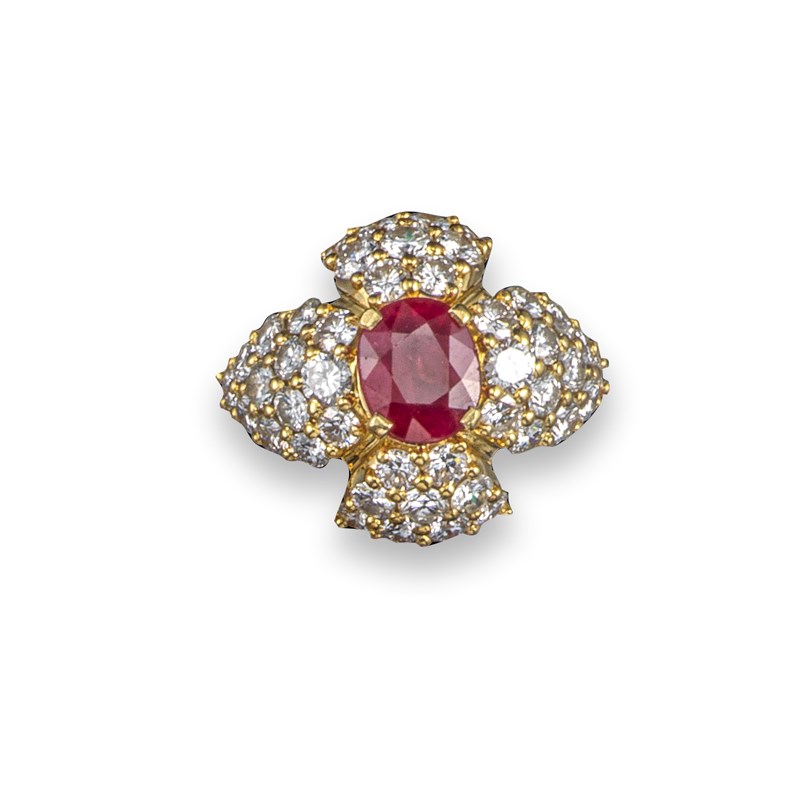 A ruby and diamond cluster ring, of flowerhead design, centred with an oval-shaped ruby, the petals pavé-set with round brilliant-cut diamonds in yellow gold, size N