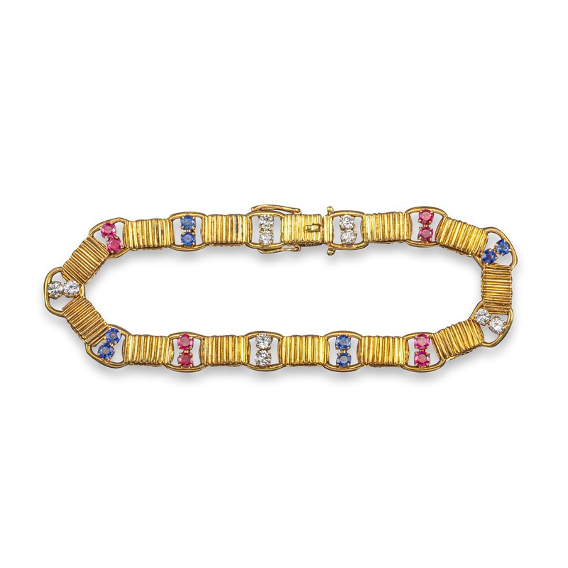 A gem-set gold bracelet by Boucheron, the fluted gold links separated with pair of rubies, sapphire and diamonds in yellow gold, signed, 20cm long