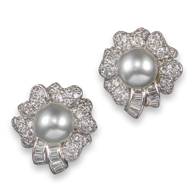 A pair of cultured pearl and diamond foliate earrings, the central white cultured pearls within pave-set diamond petals and baguette-shaped diamond scrolls in platinum, 2.6cm high