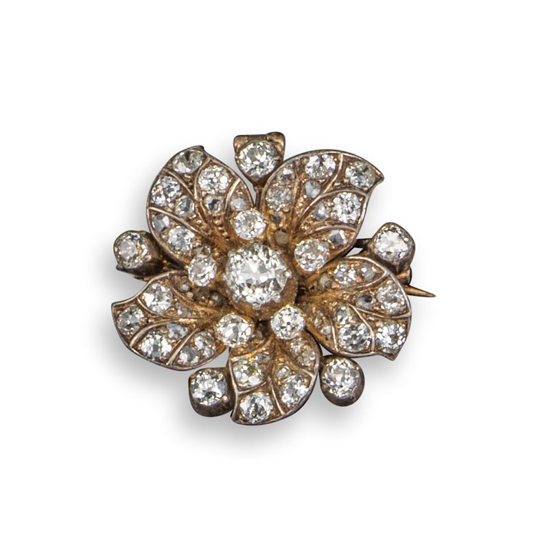 A Victorian diamond-set flower brooch pendant, set overall with graduated old circular-cut and rose-cut diamonds in silver on gold, retractable pendant loop, 2.4cm high
