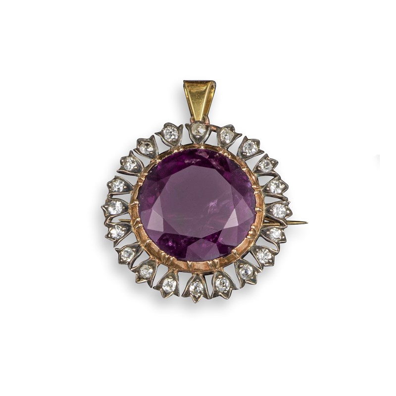 A Victorian amethyst and diamond pendant, the circular-cut amethyst is set within a surround of diamonds in fleur-de-lys settings, in silver and gold, pendant fitting to reverse, 3cm wide