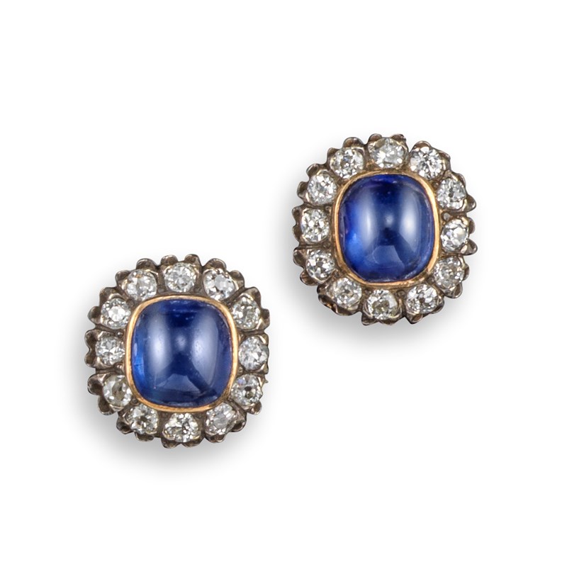 A pair of sapphire and diamond cluster earrings, the sugarloaf sapphires are set within a surround of old cushion-shaped diamonds in silver and gold, post and clip fittings, 1.3cm wide