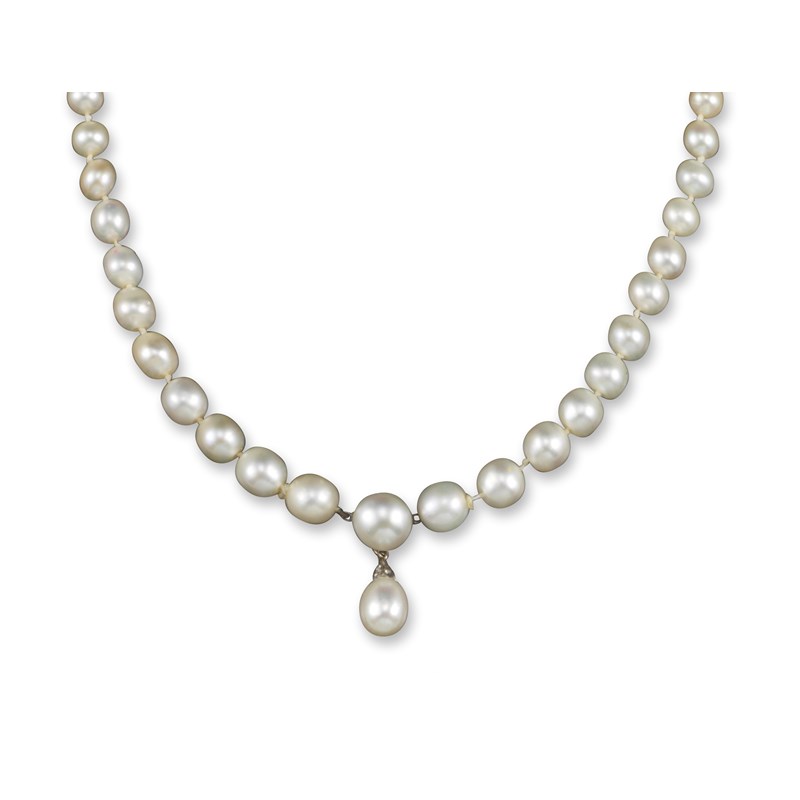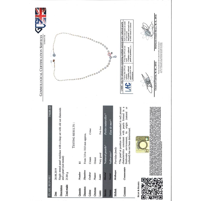 Accompanied by report number 79228-12 dated 28 August 2019 from GCS, London stating that the 85 cream pearls measure 3.0 - 10.0mm approximately and are natural saltwater, with the exception of one pearl which presents characteristics consistent with pearls formed in a freshwater environment, its origin (natural or cultured) has not been determined.