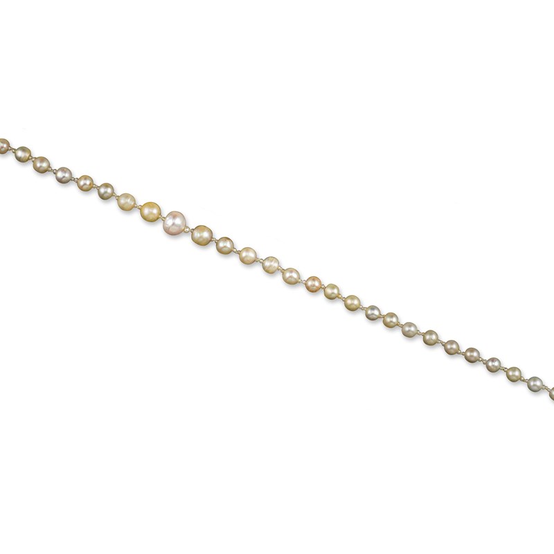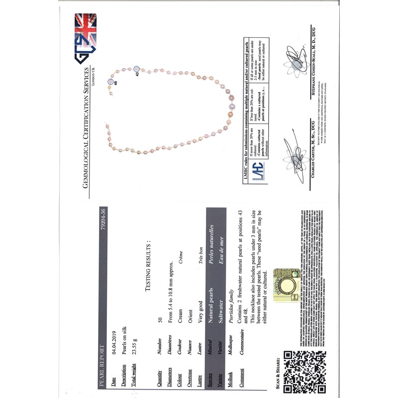 Accompanied by report number 79204-56 dated 4 April 2019 from GCS, London stating that the cream pearls measure 5.4 - 10.8mm diameter approximately and are natural saltwater with the exception of 2 freshwater natural pearls.