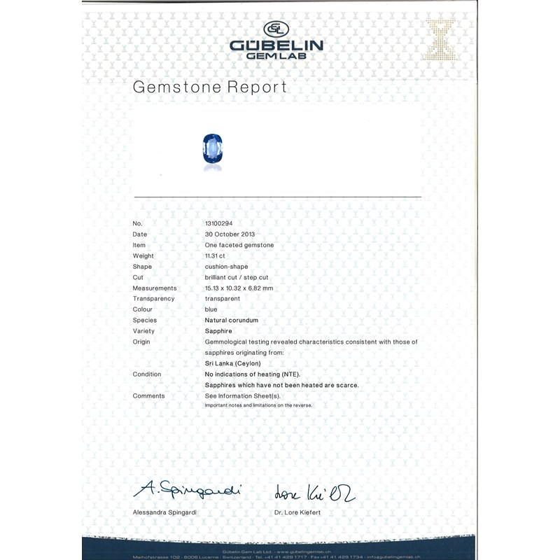 Accompanied by report number 13100294 dated 30 October 2013 from Gübelin stating that the cushion-shaped sapphire weighs 11.31cts and is a natural sapphire with no indications of heat treatment. Origin: Sri Lanka (Ceylon)