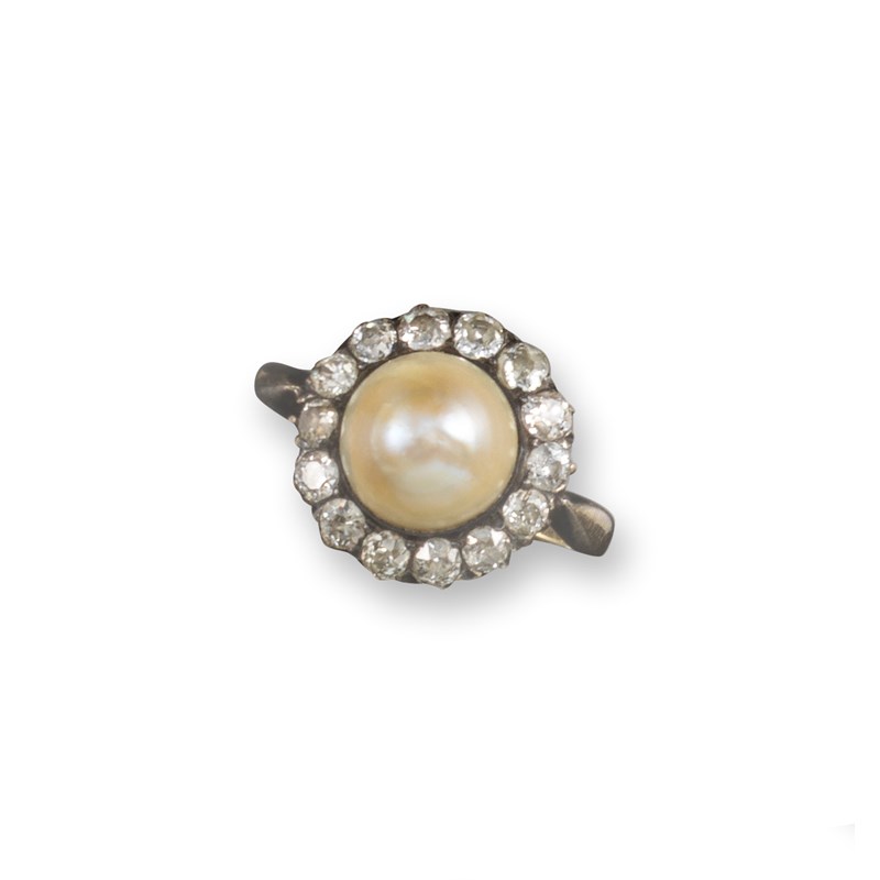 A 19th century pearl and diamond cluster ring, the central pearl set within a surround of cushion-shaped diamonds in gold, size N 1/2