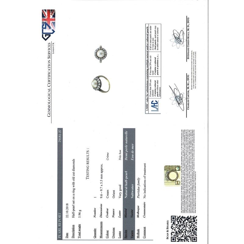 Accompanied by report number 79181-27 dated 22 October 2018 from GCS, London stating that the cream half-pearl measures 9.6 - 9.7 x 5.5mm approximately and is natural saltwater with no indications of treatment.